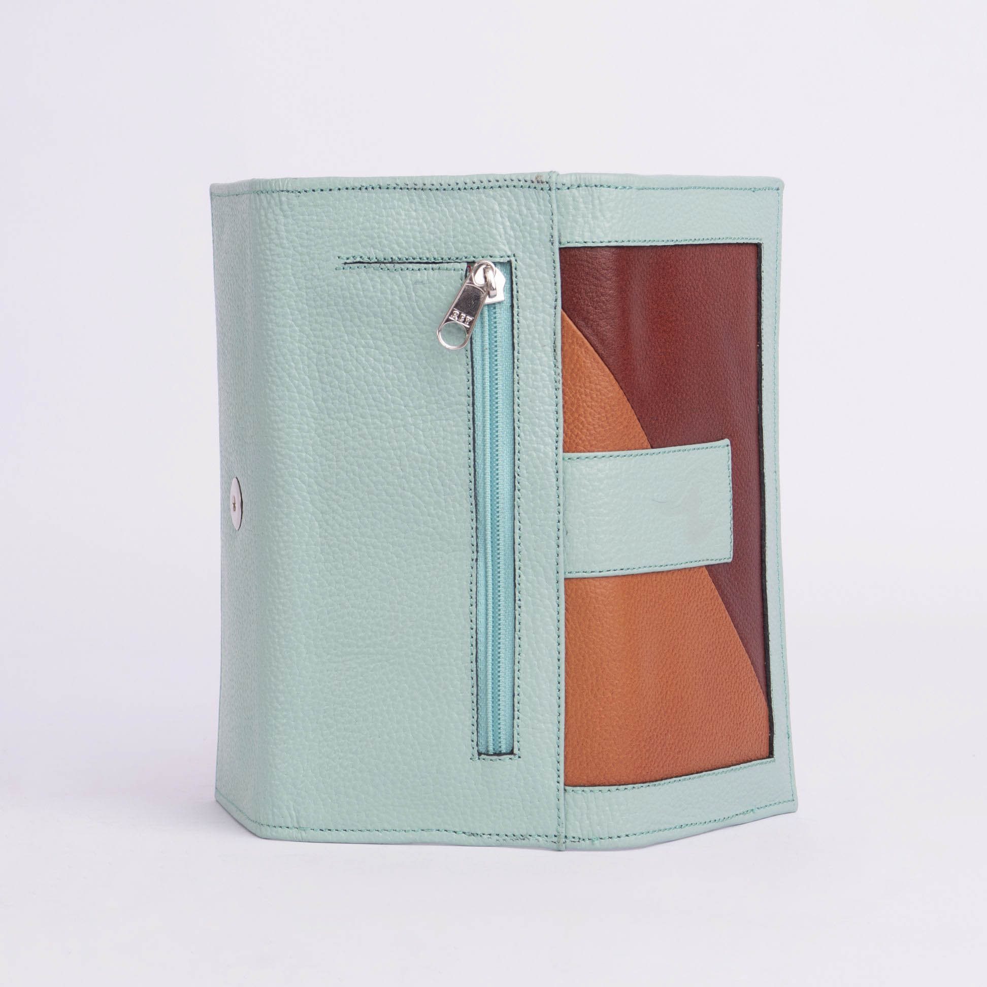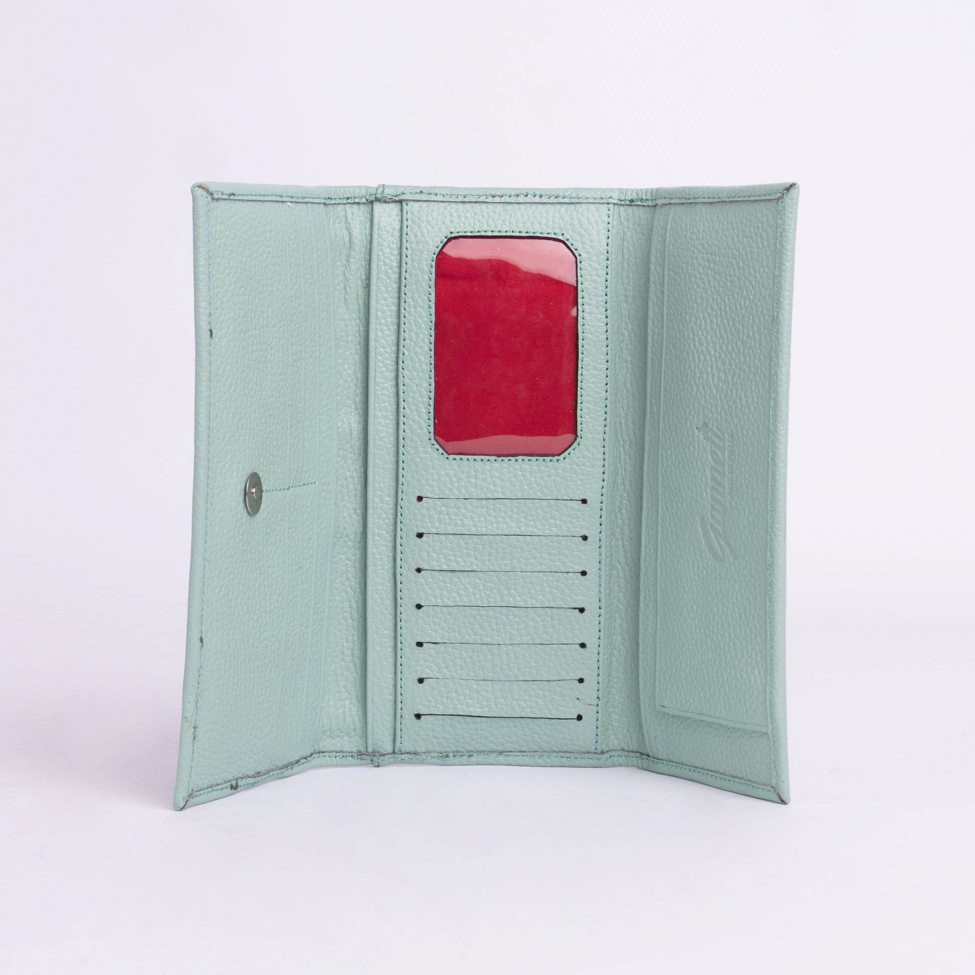 3 cuerpos , con broche imantado y 1 bolsillo externo con cierre . Posee en su interior 5 compartimientos para billetes , 12 ranuras para tarjetas y 1 ventana.
