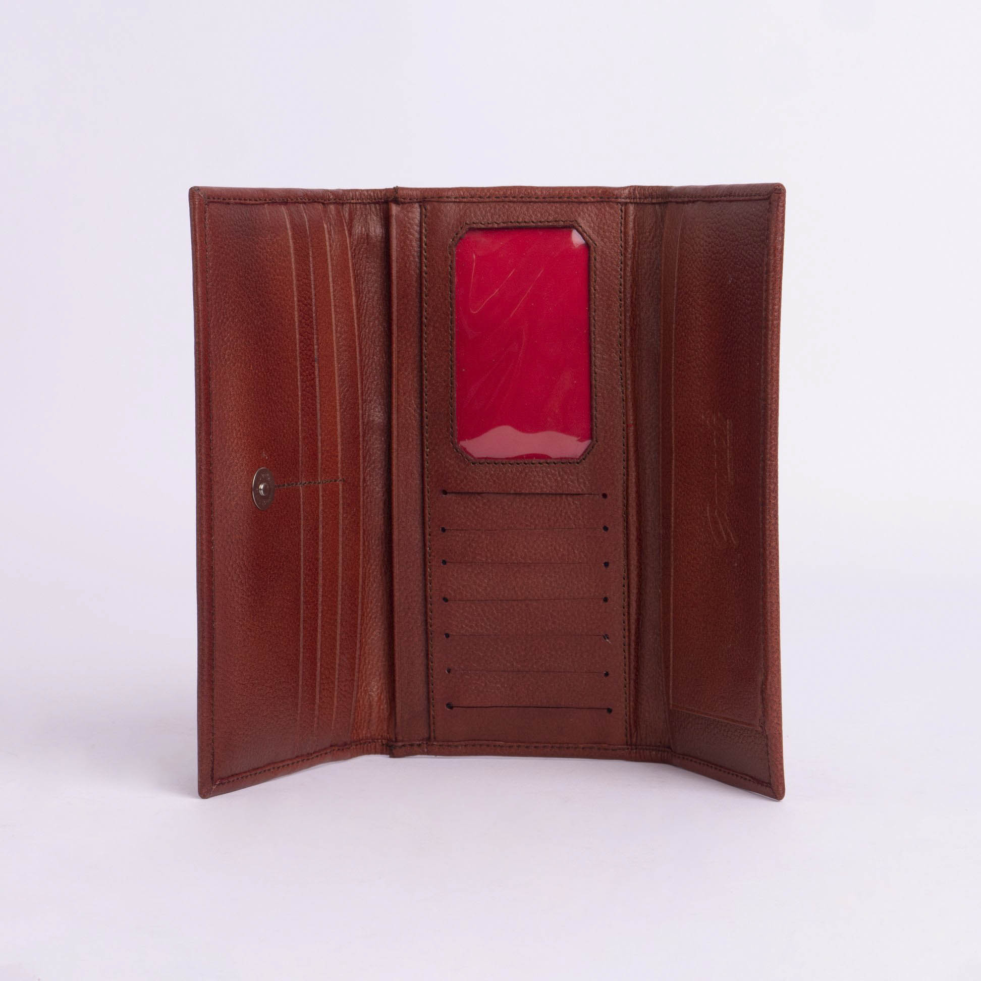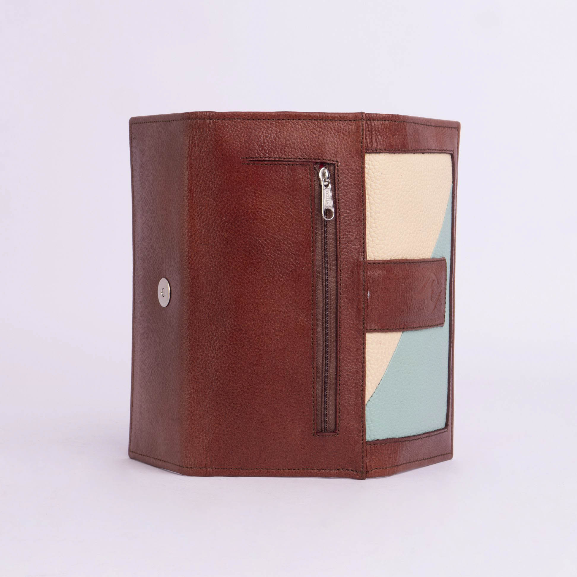 3 cuerpos , con broche imantado y 1 bolsillo externo con cierre . Posee en su interior 5 compartimientos para billetes , 12 ranuras para tarjetas y 1 ventana.