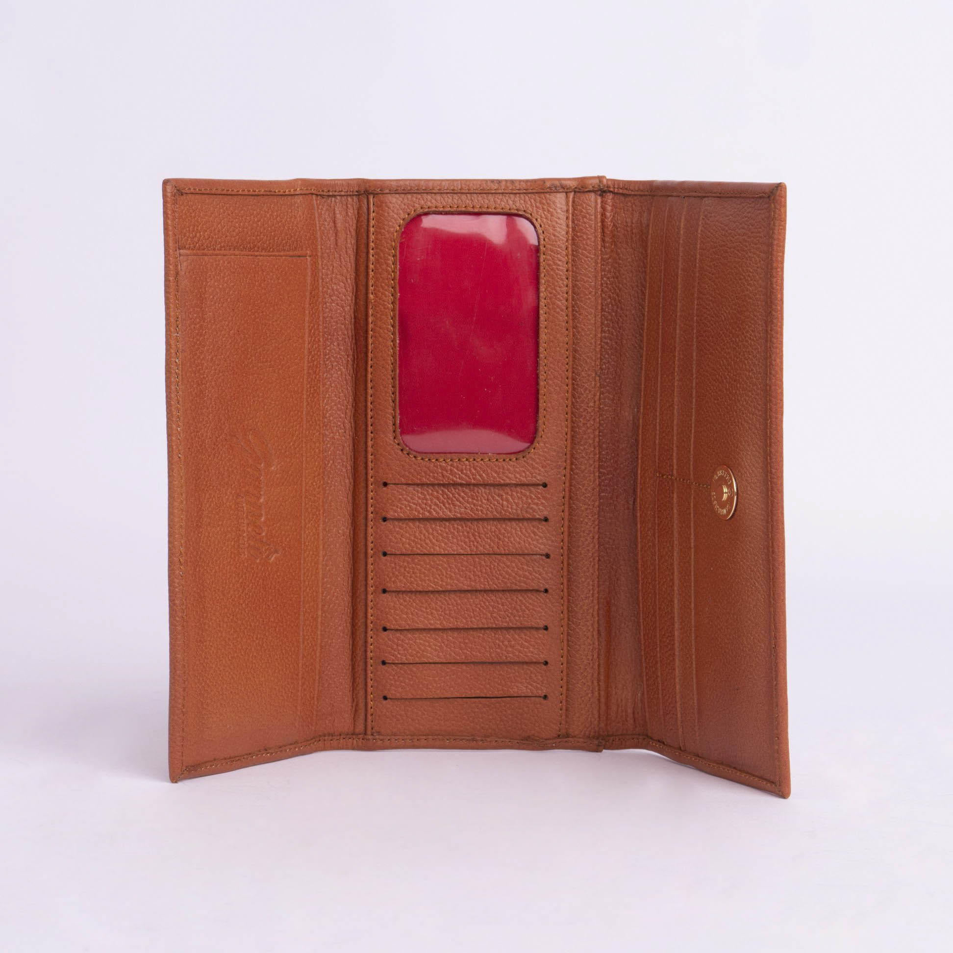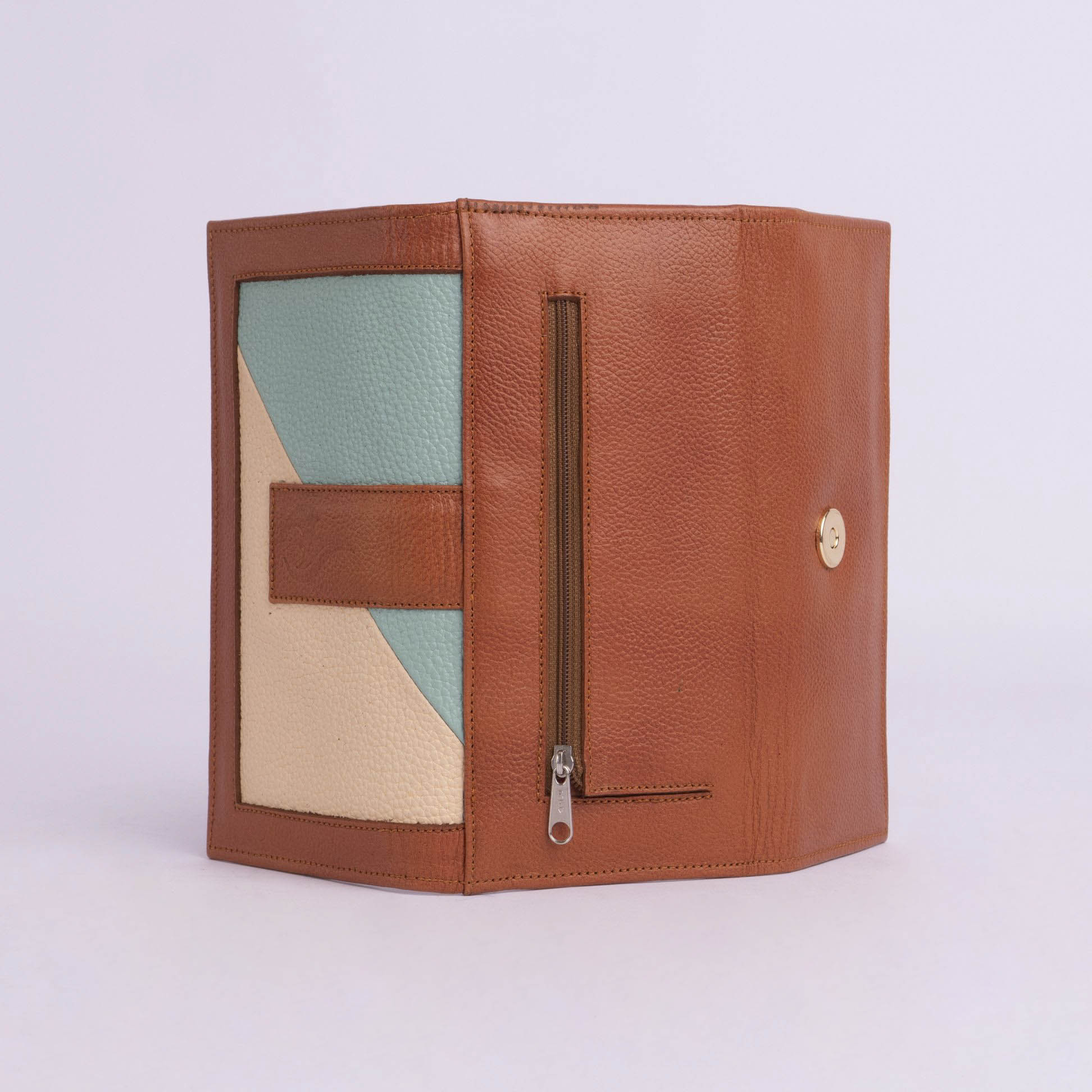 3 cuerpos , con broche imantado y 1 bolsillo externo con cierre . Posee en su interior 5 compartimientos para billetes , 12 ranuras para tarjetas y 1 ventana.