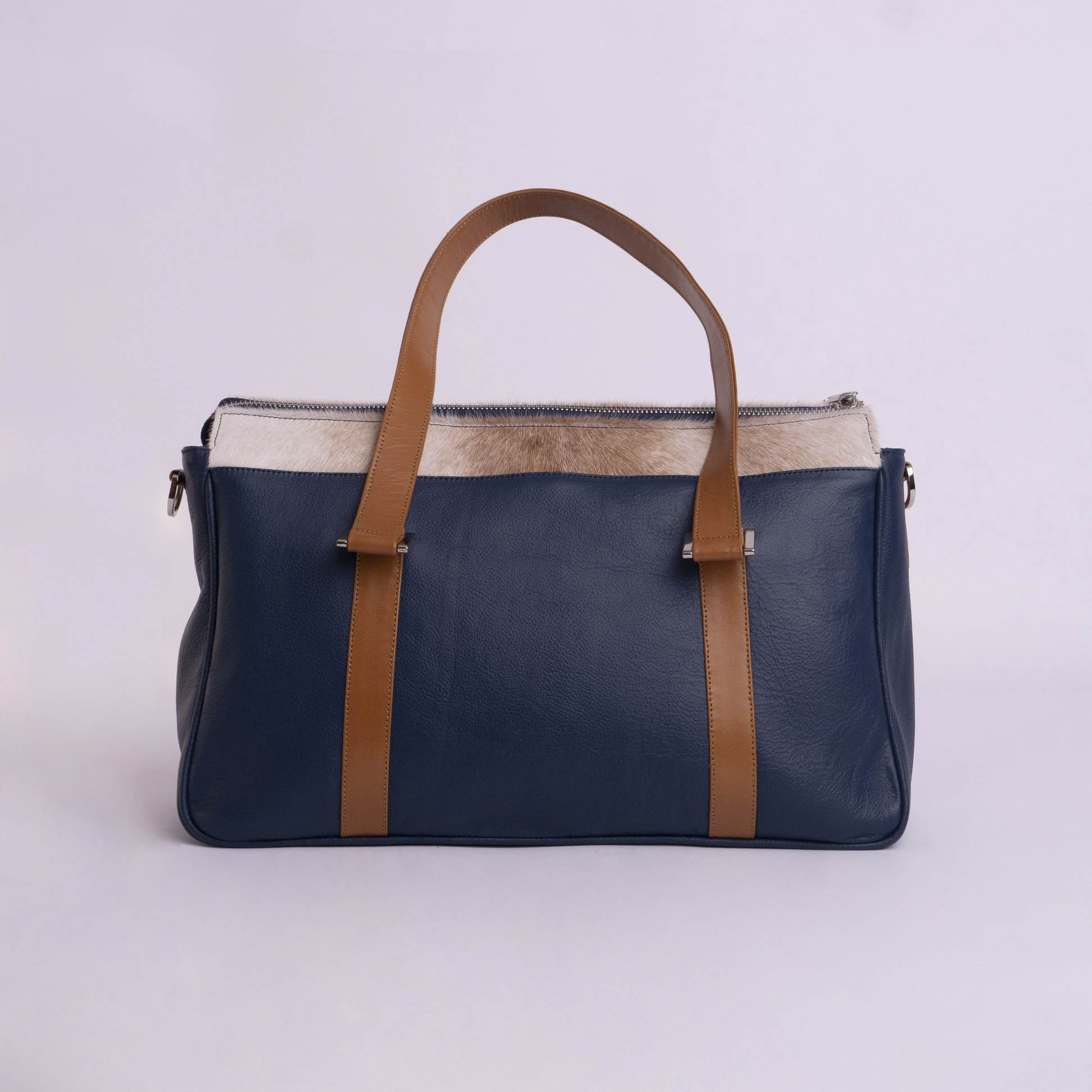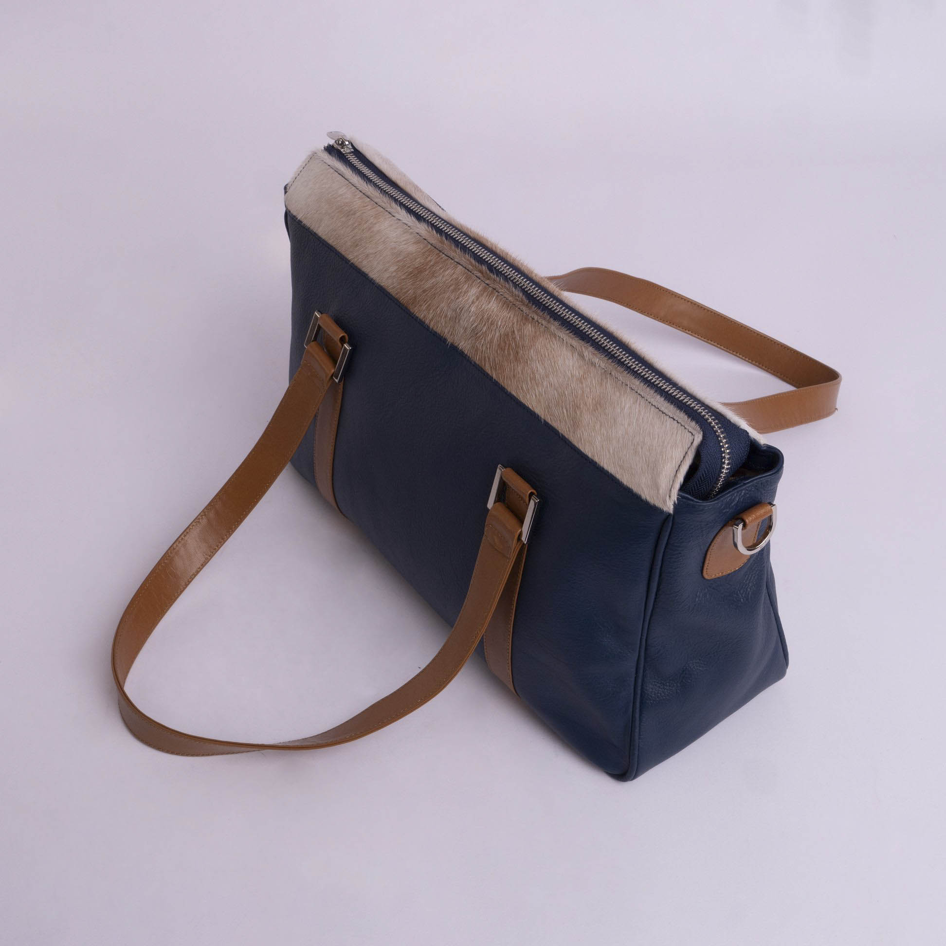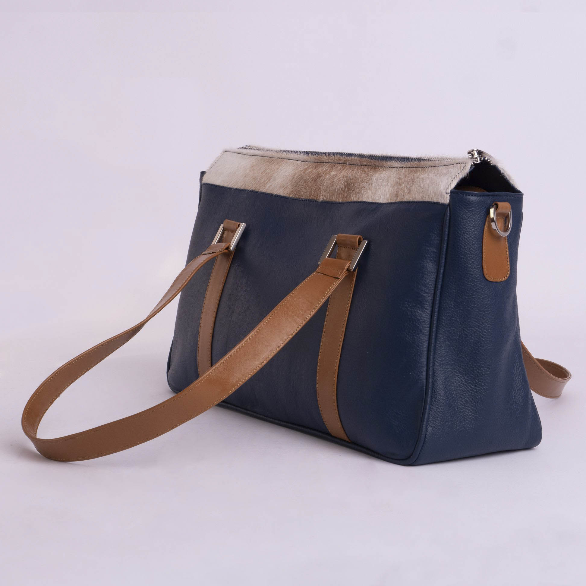 Aplique:  Cuero liso camel y pelo vacuno