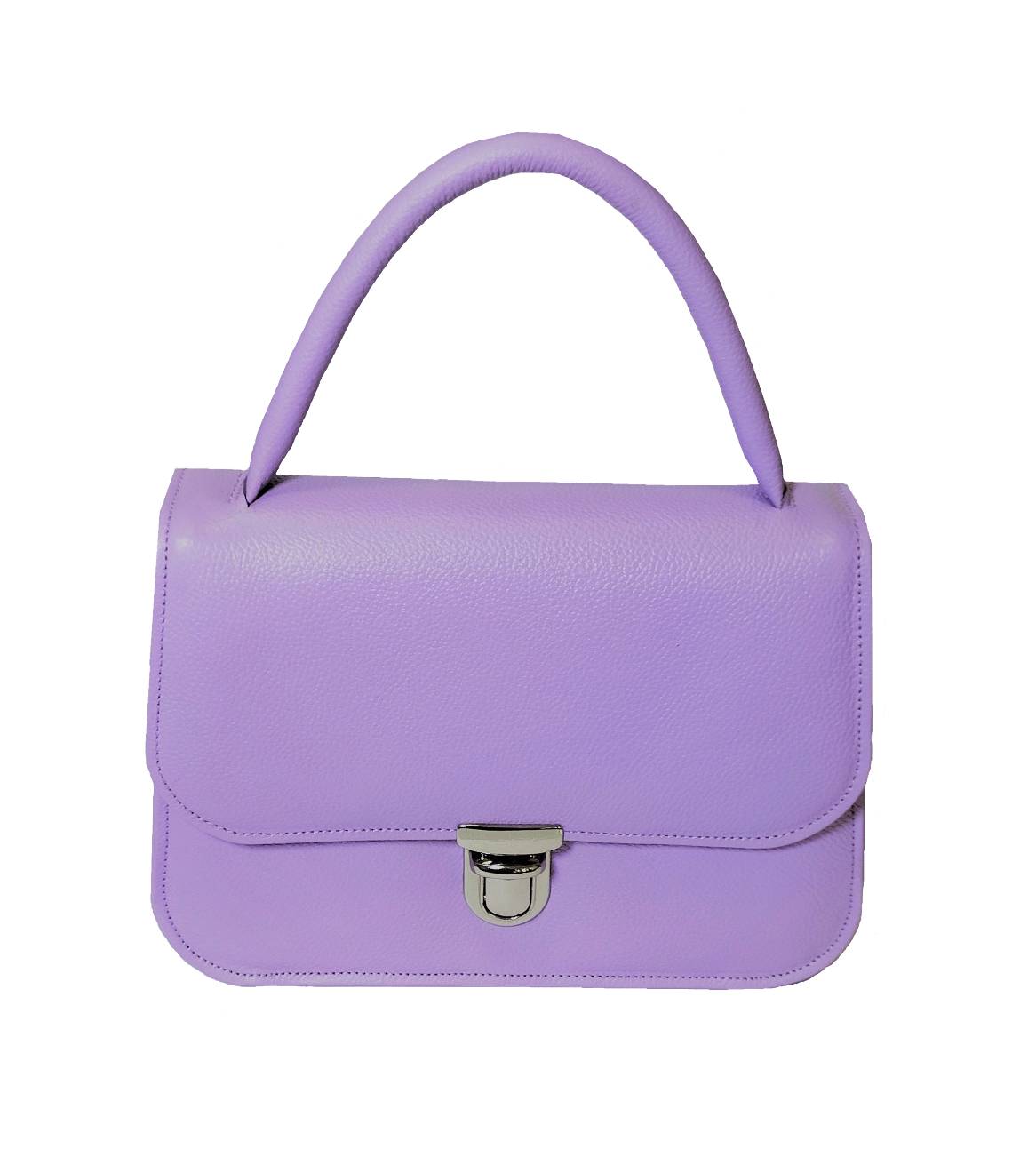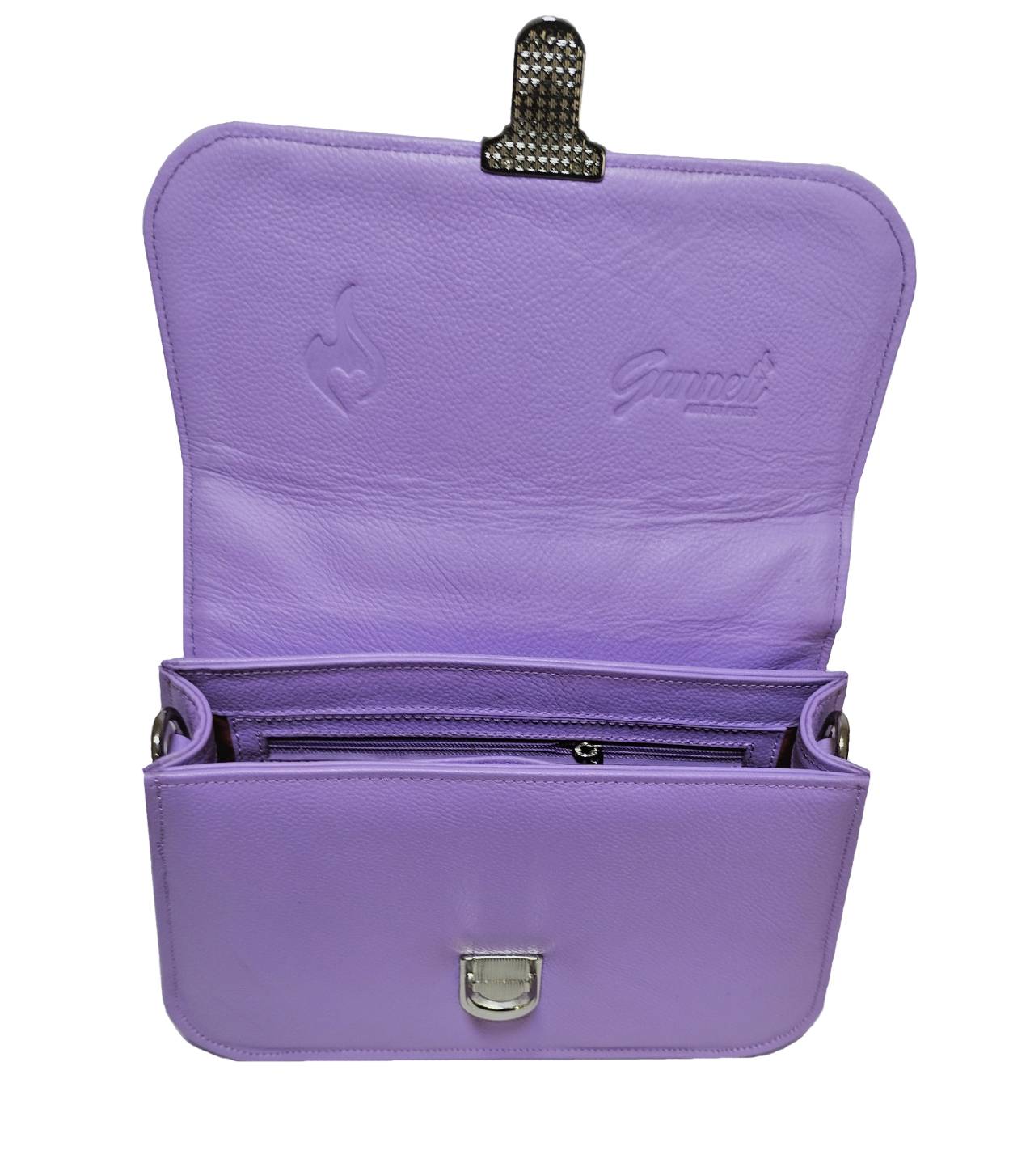 Cartera de mano estructurada en cuero minifloater con tapa y chapa inoxidable; de doble funcionabilidad (asa de mano y asa para cruzada). Posee también 1 compartimiento principal, 1 bolsillo interior con cierre y 1 bolsillos porta celulares internos.